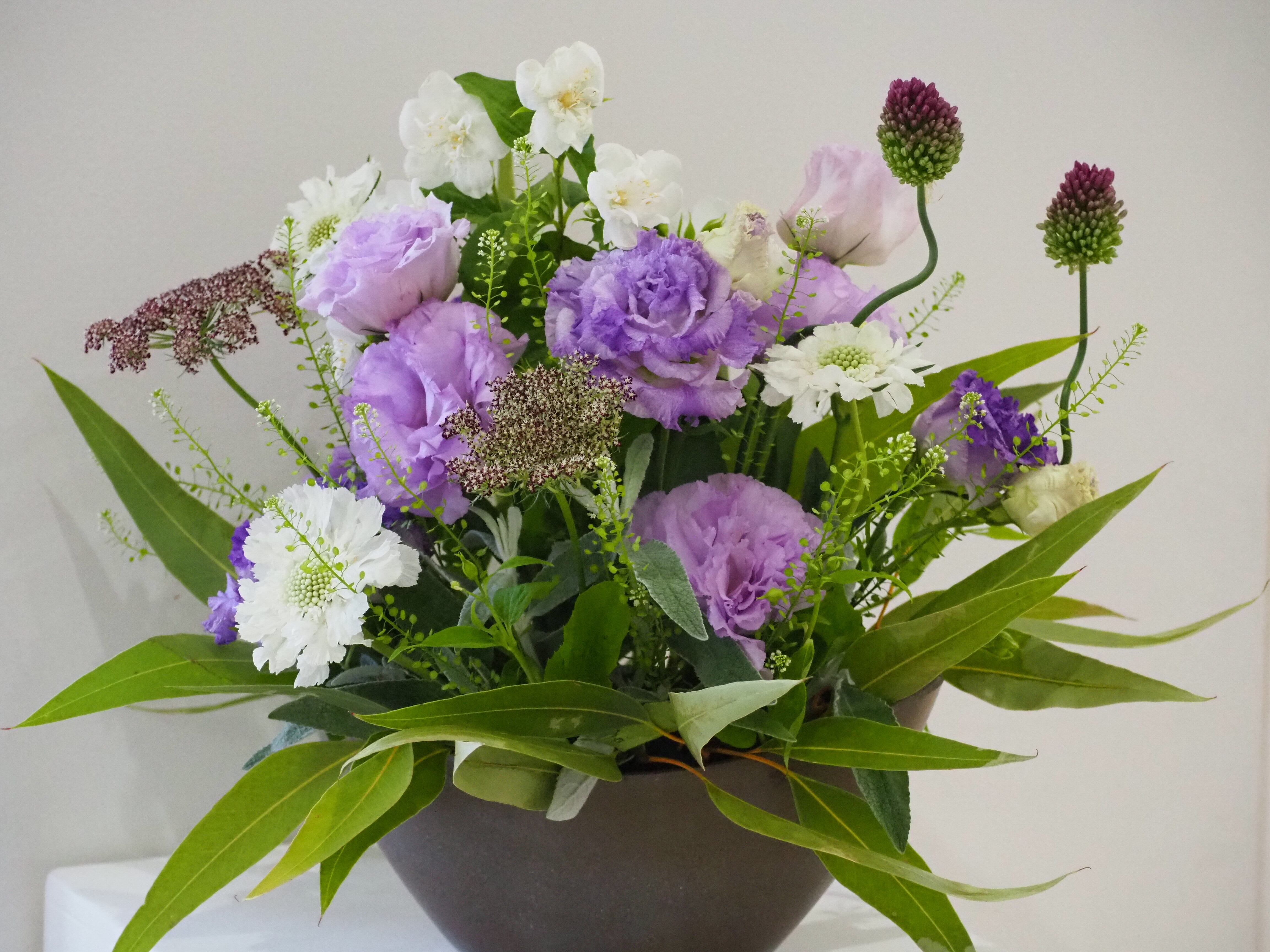 そのときどきの旬の花を見極めて、色合いやバランスを大切に、ひとつひとつ丁寧にお作りしています。